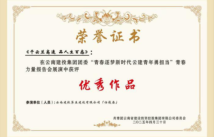 2025年五四青年節(jié),集團(tuán)舉辦“青春逐夢新時(shí)代 云建青年勇?lián)?dāng)”青春力量報(bào)告會(huì)。展演中,由公司團(tuán)委、市政路橋四部聯(lián)合編創(chuàng)的脫口秀《干云蘭高速,品人生百態(tài)》作品獲評(píng)“優(yōu)秀作品”。