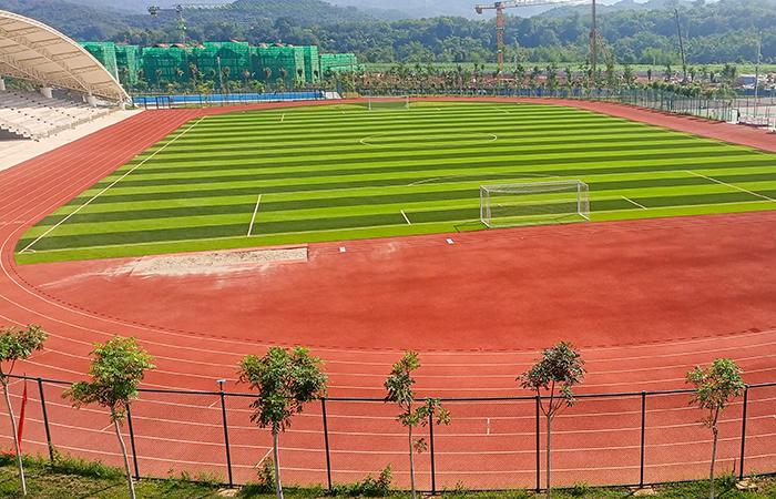 熱帶雨林的螞蟻也很熱情,剛進(jìn)場時,測量員在茂密的草叢穿梭找點,晚上下班回來時能擦完一整瓶藥膏。后來,在20多臺機(jī)械和100多名管理人員及工人的奮戰(zhàn)下,茂密的草叢變成一條條明亮的道路。看,已經(jīng)到了運(yùn)動健兒們最喜歡的地方,國際運(yùn)動比賽水平的400米足球場,硅膠籃球場,為這個新建的校區(qū)增添了勃勃生機(jī)。