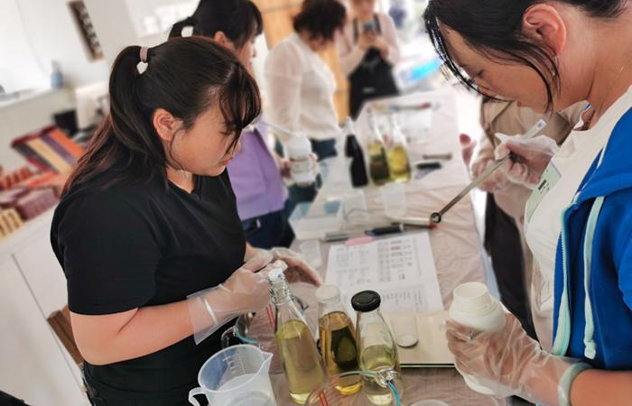 在專業(yè)芳香師的指導下,參加活動的職工兩人一組、通力配合,在掌握精確的溫度和重量后,大家在量杯中有序地加入各種原料和自己喜歡的精油,通過持續(xù)攪拌,神奇的化學反應給大家?guī)砹梭@喜,皂液倒入模具后呈現(xiàn)的各種形狀也讓人賞心悅目。