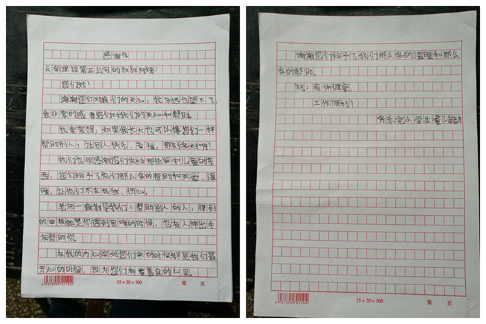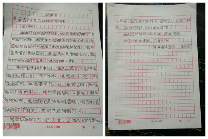 活動(dòng)結(jié)束后,兩名小朋友委托集團(tuán)扶貧工作隊(duì)給公司寄來了感謝信。青年職工們表示在這樣的實(shí)踐活動(dòng)中不僅學(xué)習(xí)了雷鋒精神還感受到了企業(yè)的責(zé)任與擔(dān)當(dāng)。