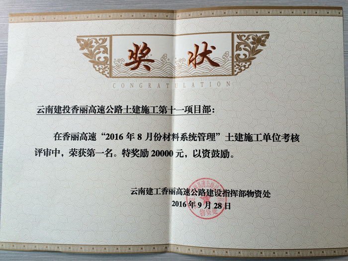 項目部在2016年獲得產(chǎn)值累計位列全線第一名,獎勵人民幣30萬元;項目部按期完成主線施工便道貫通,給予全線通報表揚,獎勵人民幣10萬元,香麗高速全線13家土建參建單位目前只有第三項目部和第十一項目部主線施工便道順利貫通;項目部的物資部在指揮部“7月份材料系統(tǒng)管理”考核評審中榮獲油料最佳管理獎,獎勵10000元,在“8月份材料系統(tǒng)管理”考核評審中榮獲第一名,獎勵20000元。項目部在2016年共獲得4個獎項,共計43萬元的獎金。項目部將再接再厲,持續(xù)前進(jìn)。