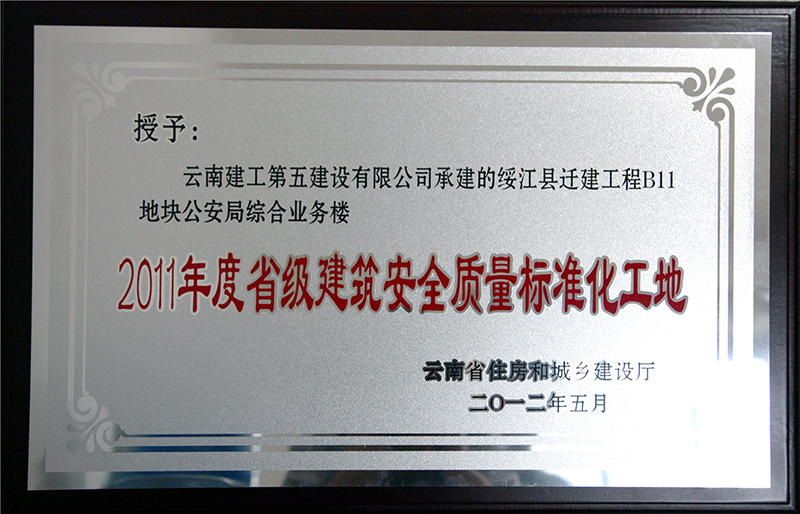 綏江項(xiàng)目部承建施工的綏江縣遷建工程B11地塊公安局綜合業(yè)務(wù)樓工程獲“2011年度省級(jí)建筑安全質(zhì)量標(biāo)準(zhǔn)化工地”稱號(hào)